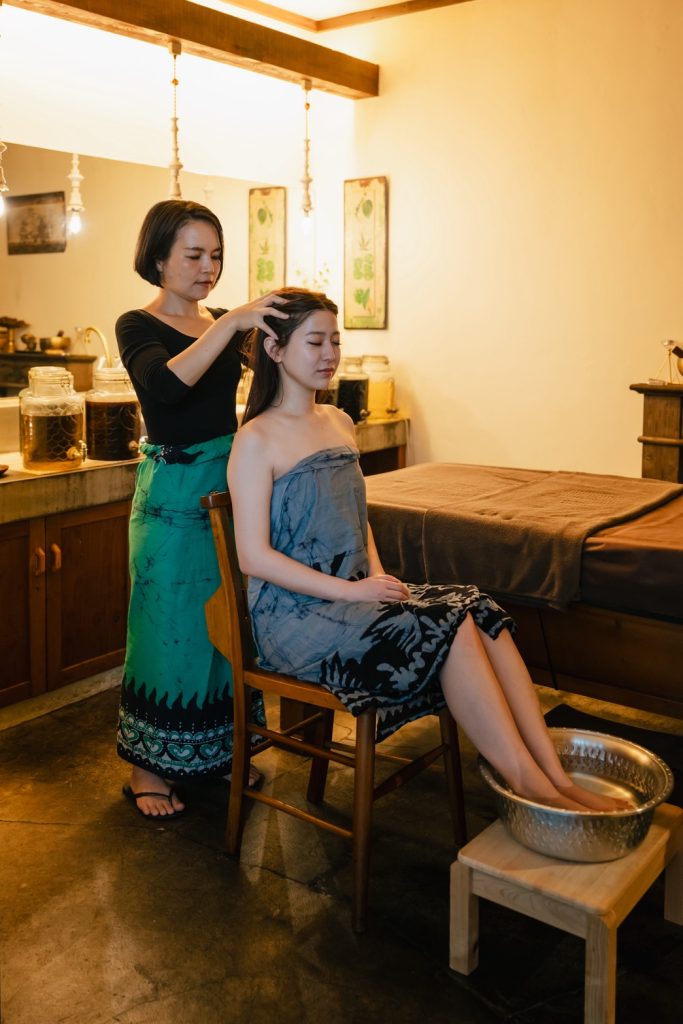 足湯でほんのり温まった身体にスリランカの大地のエネルギーをたっぷり取り込んだハーブオイルを使って全身の循環を高めます。母が我が子にふれるような感覚で、心身ともに穏やかにリラックス。