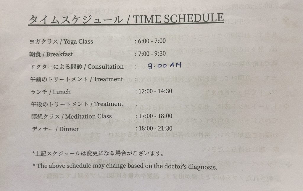 チェックインのときにいただいた実際のスケジュールがこちら!